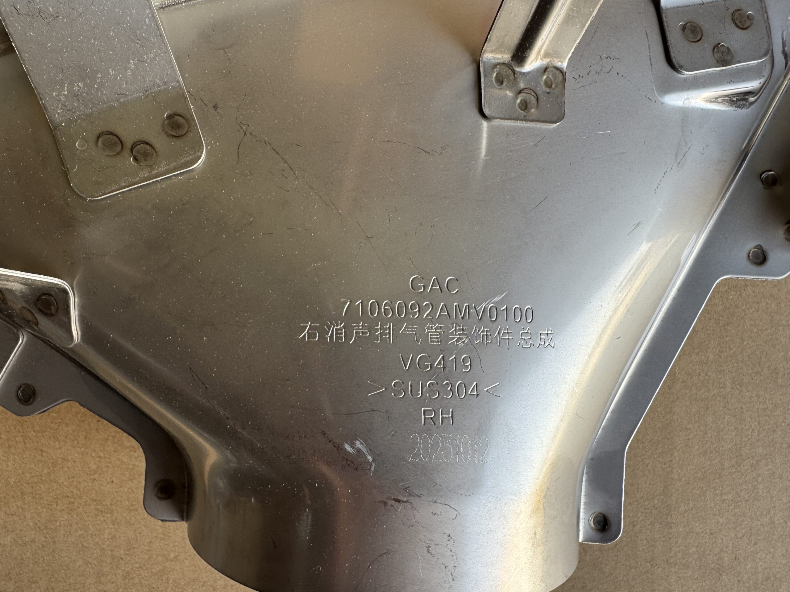 A genuine GAC right-side exhaust pipe trim designed to enhance the exterior look while providing light heat shielding around the exhaust outlet. Made from high-grade stainless steel for durability and long service life. Ideal OEM replacement for broken or missing exhaust trim pieces.